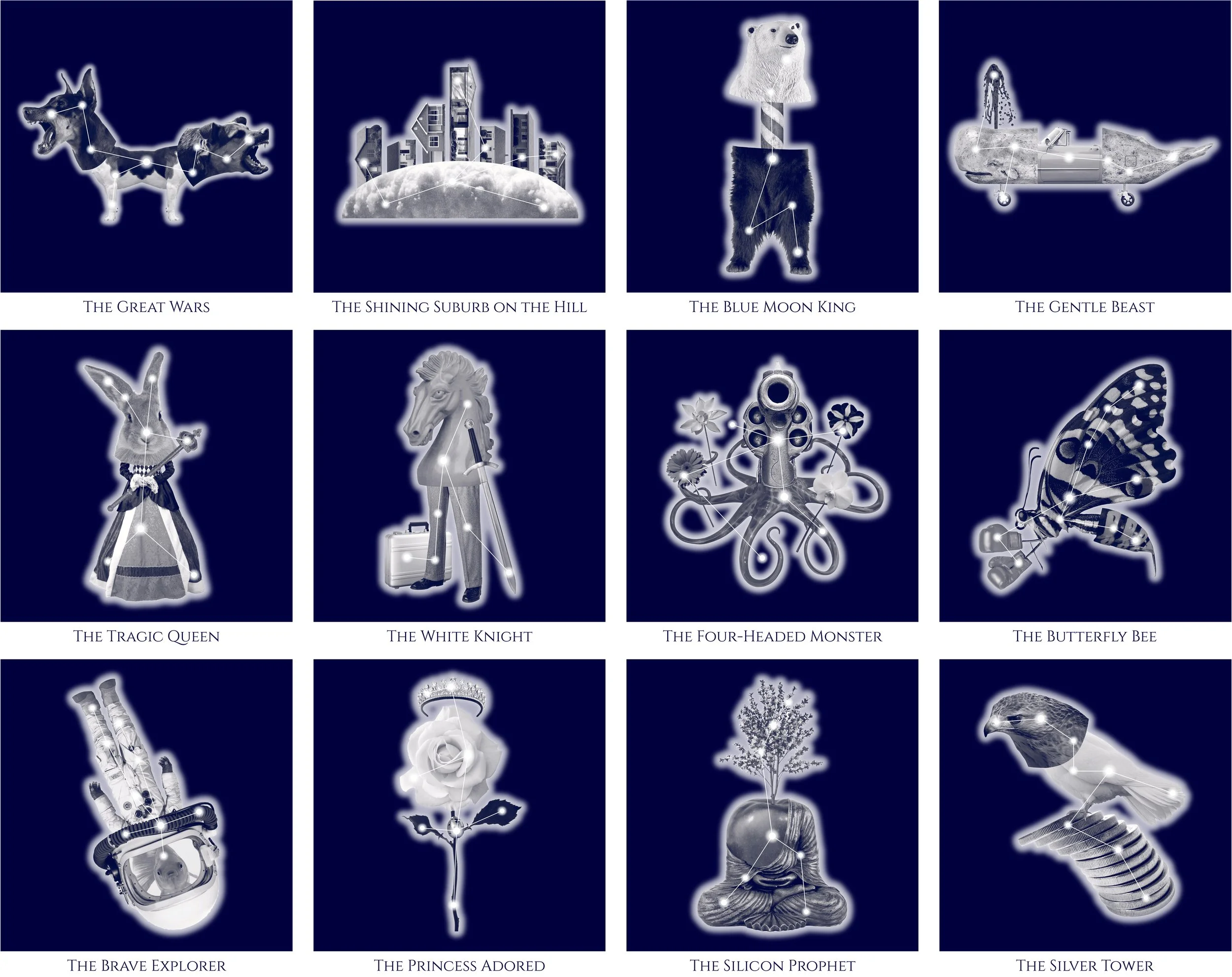 The constellations that we recognize today are based on a 2,000-year-old mythology derived from the ancient Greeks. Their heroes, villains, mortals, and gods ascended into the sky for all eternity. Inspired by the seminal work of comparative mythology, The Hero with a Thousand Faces by Joseph Campbell, Humann superimposes a new constellation system over our existing one. He creates a new mythology and a new folklore, by taking popular figures of the 20th Century and then developed a visually metaphoric and encapsulated story arc that accompanies them.