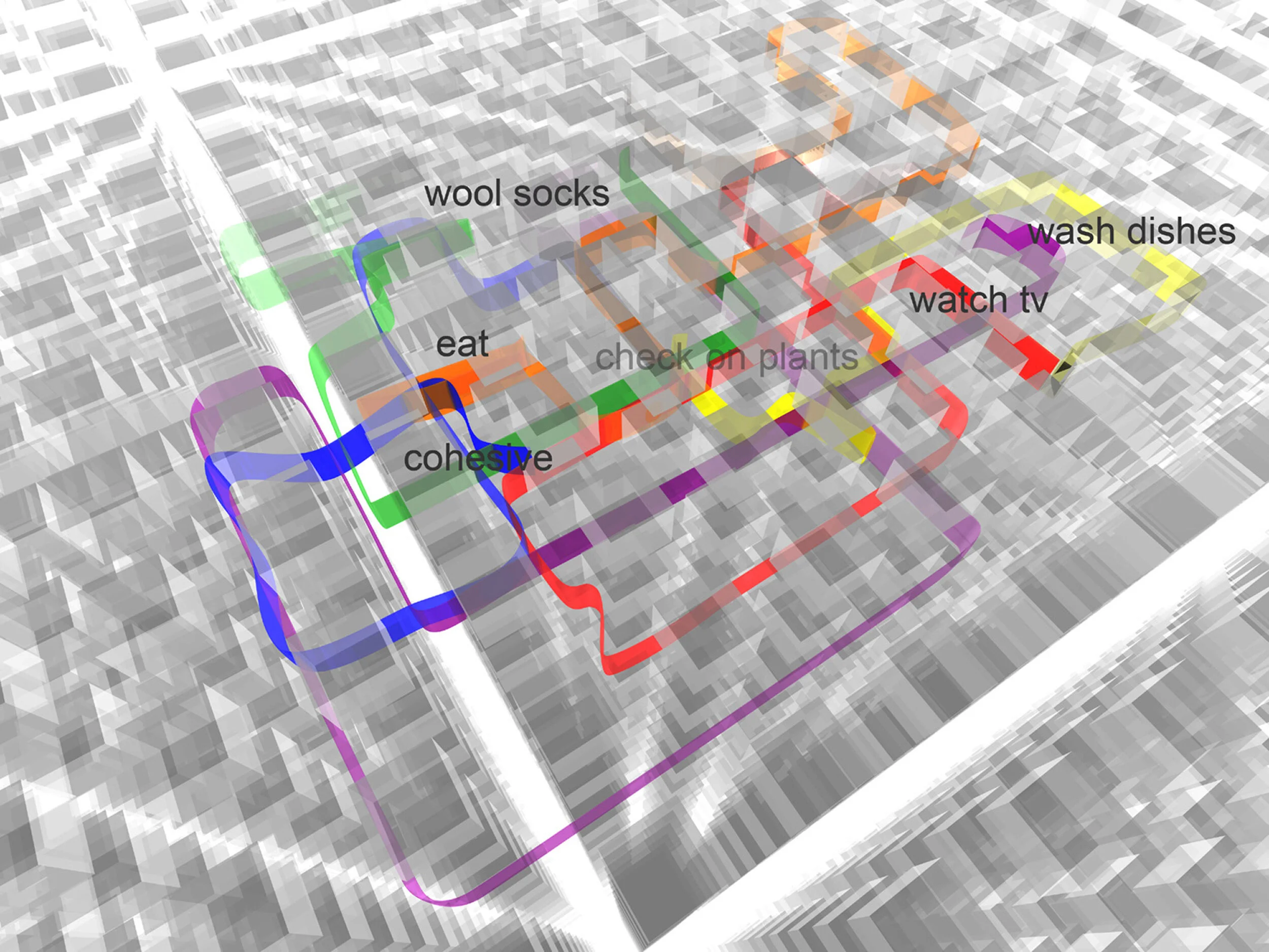 The information was then fed to a programmer who placed these movements onto a grid, assigning each participant a color, which then developed into a pattern of daily life. Ghost Trails is as much about the past as it is about the present or a prediction of the future.
