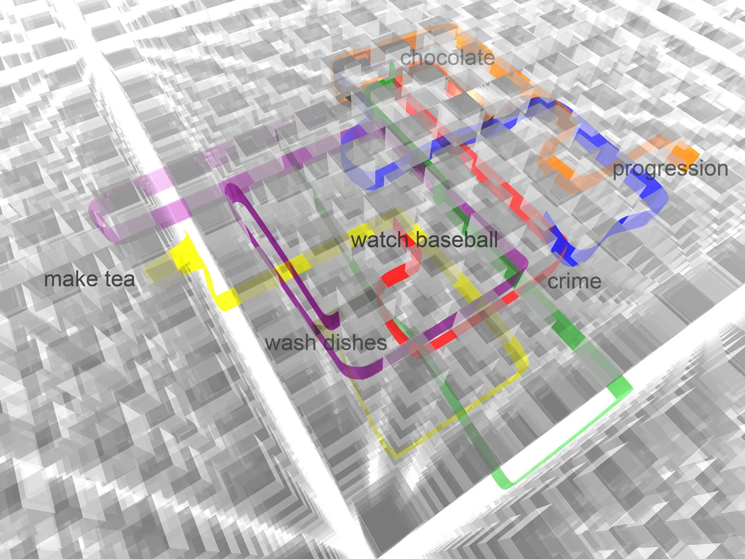 Ghost Trails was conceived and produced as a website artwork. For it, six people from multiple countries around the world voluntarily recorded and submitted movements of their daily life. The movements were not based on geographical location, or physical tracking but instead were based on daily activities; things that each of them did on a daily, or semi-daily routine. For example: putting on socks, eating chocolate, drinking alcohol or coffee, taking a walk, etc.—banal and ordinary daily activities that might otherwise be overlooked.